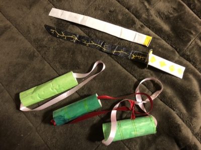 気づいたらこんなものを作っていました。よく作るなぁ…(笑)ただ、これは初めて作った刀で、紙製なのでとても弱い…。セロテープを巻いて本人なりに補強をしたつもりなんでしょうが、ペンぺらで鞘にしまいにくくて、長男は刀を抜きたがるのですが、自分で収められないのでブチ切れて放り投げ…。仕方がないので鞘に近い刀のところだけ段ボールで補強したのですが、全部をすると今度は収まらなくなるので中途半端な感じになってしまいました。長女は「今度は段ボールで作る!」「早く休みの日が来ないかなぁ」と勢い込んでいます…。