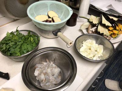 休みならでは。伊勢芋をいただいたのでてんぷらにしてみようとほかの具材も仕入れ。