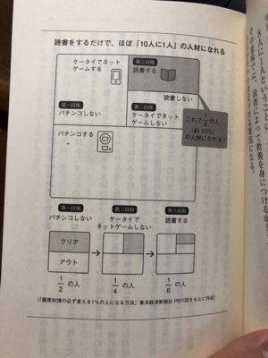 そしてそのとき、『読書をするかしないか』、この選択で人生を幸せにすることができるかできないかが決まって来る。ここで『読書をする』を選ぶと8分の1、つまりほぼ10分の1の選択肢を取ったことになる、したがって10分の1の人材になれる。こういう主張なわけです。