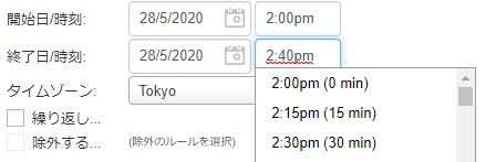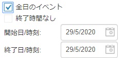 • イベントの日付と時刻:時刻が設定されている予定なら「開始日/時刻」「終了日/時刻」を選びます。もし該当する時刻がなければ変更します。