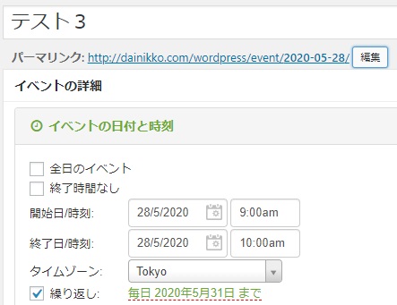 • パーマリンク(=スラッグ):URLで表示される予定の名前。予定日「西暦‐月-日(例.2019-05-28)」を入れます。記事が複数ある場合は後ろに「_1」とつけます。