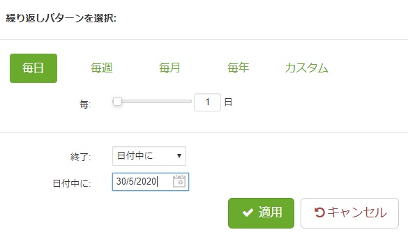 例3)5/28~5/30 毎日午前9:00~10:00 の場合初日の日付で設定し、繰り返しにチェックを入れます。出てきた画面で「終了」を「日付中に」、「日付中に」を予定の最終日にします。
