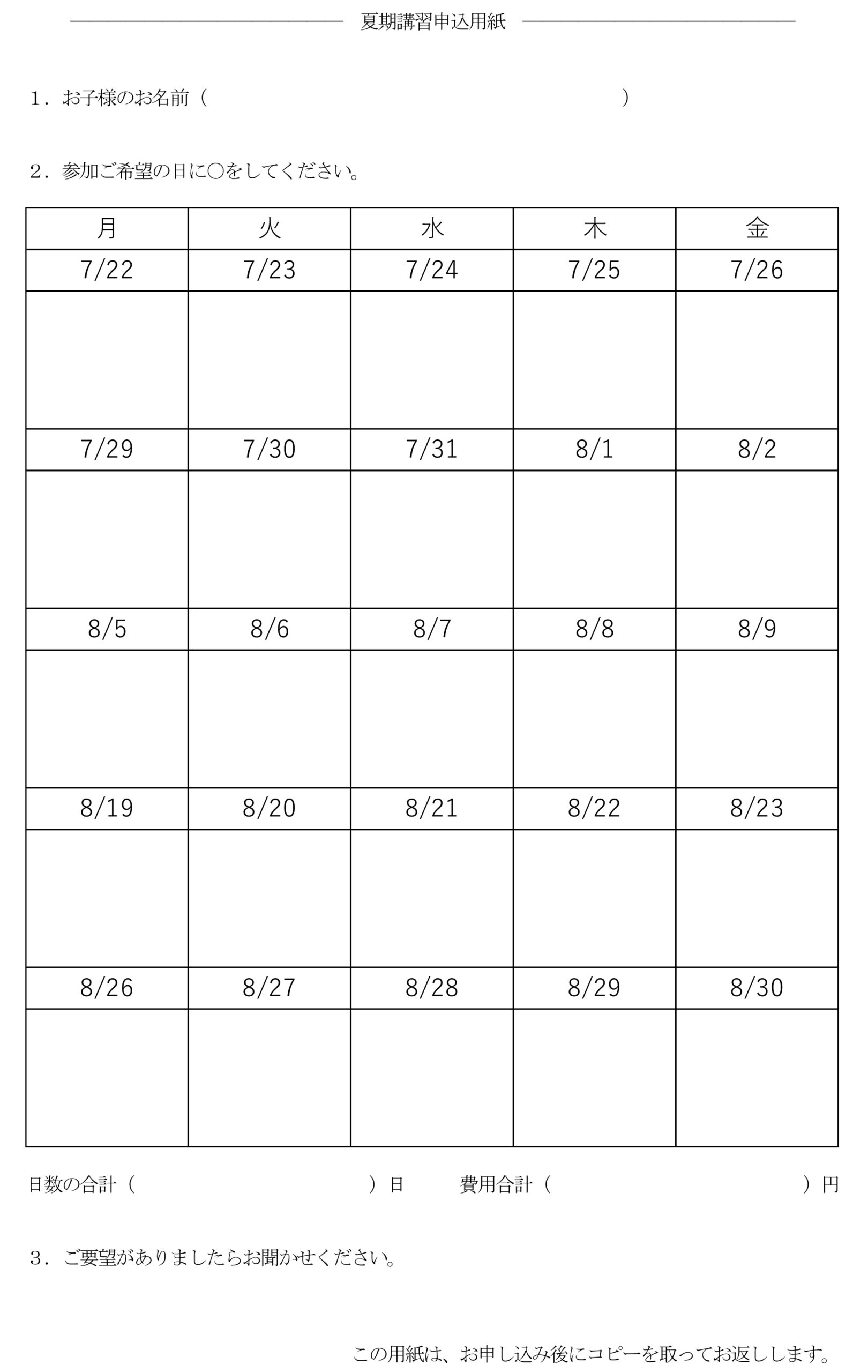 7/22(月)~8/9(金)、8/19(月)~8/30(金)の間の月曜から金曜まで(途中からでも大丈夫です。)
